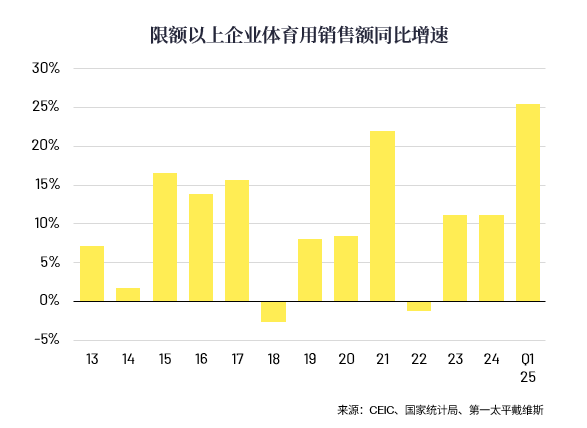 体育运动消费规模不断扩大,已成为消费市场的重要增长点。国家统计局数据显示,体育运动用品类2025年第一季度的限额以上企业销售增幅高达25.4%,创下近三年来新高。