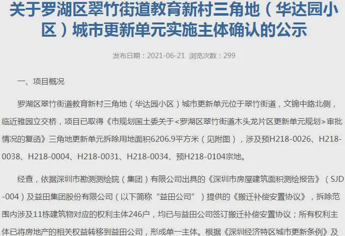 6月21日,罗湖区桂园街道蔡屋围城市更新统筹片区城市更新单元一期子项目A地块、翠竹街道教育新村三角地(华达园小区)城市更新单元及东门街道湖贝统筹片区城市更新单元一期A1地块发布实施主体确认公示,分别为京基、益田及华润主导。