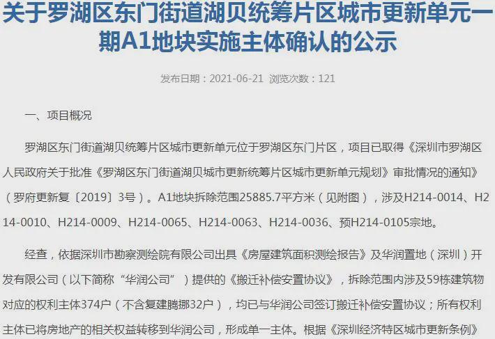 2021年6月21日,项目一期A1地块实施主体确认公示,即华润置地(深圳)开发有限公司。