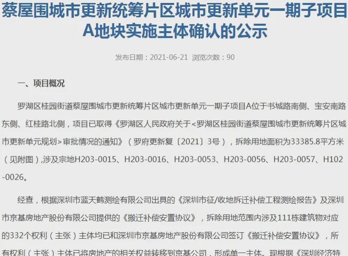 2021年6月21日,项目一期子项目A地块实施主体确认公示,即深圳市京基房地产股份有限公司。