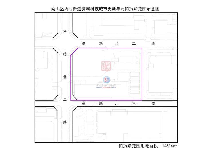 赛霸科技城市更新单元位于南山区西丽街道科技北二路和高新北三道交汇处,项目拆除范围用地面积14634㎡。拟更新方向为新型产业功能。