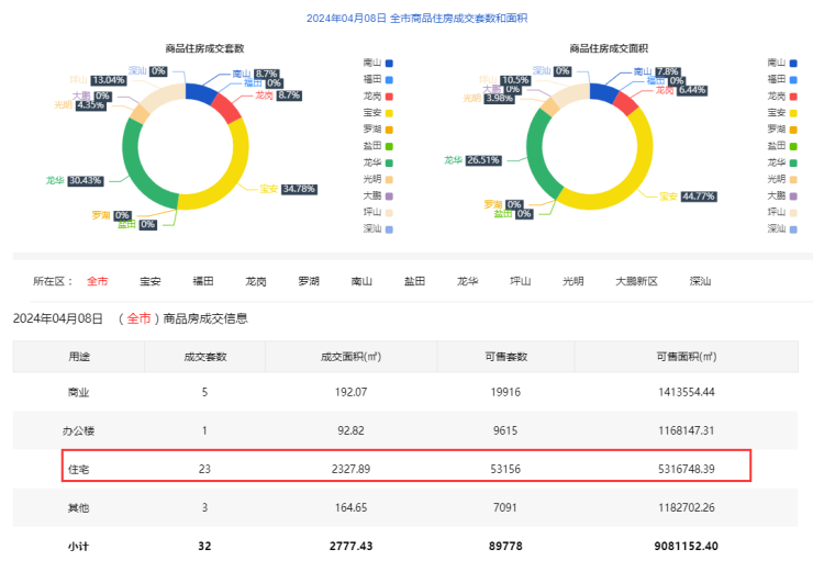 2024年4月8日新房住宅共网签23套。宝安8套;福田0套;龙岗2套;罗湖0套;南山2套;盐田0套;龙华7套;坪山3套;光明1套;大鹏0套;深汕0套。