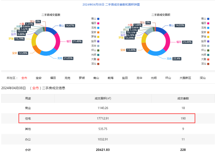 2024年4月8日二手房住宅网签190套。宝安22套;福田41套;龙岗45套;罗湖25套;南山27套;盐田2套;龙华20套;光明2套;坪山3套;大鹏3套。