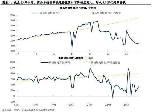 兴业证券以信贷收支表当中的居民存款衡量,2022年11月以来,居民部门超额存款(相对趋势值)明显走高,截至2023年三季度,居民仍有7.5万亿元超额存款。2023年以来,超额存款的增长主要来自居民部门购房的下降。