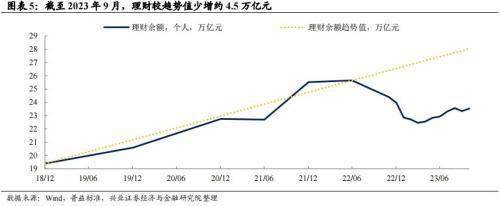 除了楼市之外,兴业证券还在研报中指出有资金有从理财向存款回流的趋势。从已有数据来看,2020年、2023年上半年,个人投资者持有规模占比分别是88%、89.1%,我们假设2018-2022年个人投资者占比稳定在88%,2023年个人投资者占比在89.1%,得到月度的个人投资者持有的理财余额,使用该余额较趋势值的差异计算这部分超额存款,截至2023年9月,理财较趋势值少增约4.5万亿元。