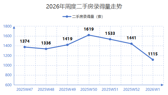 经深房中协统计,2026年第1周全市二手房(含自助)共计录得1,115套,环比下降22.6%。本周录得量下滑主要是受元旦假期阶段性影响,整体仍保持相对高位水平。另12月二手房录得6,612套,较上月增长14.8%。