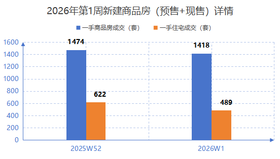 据深圳市房地产信息平台数据,2026年第1周全市新房(预售+现售)成交1,418套,环比下降3.8%。其中商办类成交929套,环比增长9.0%。
