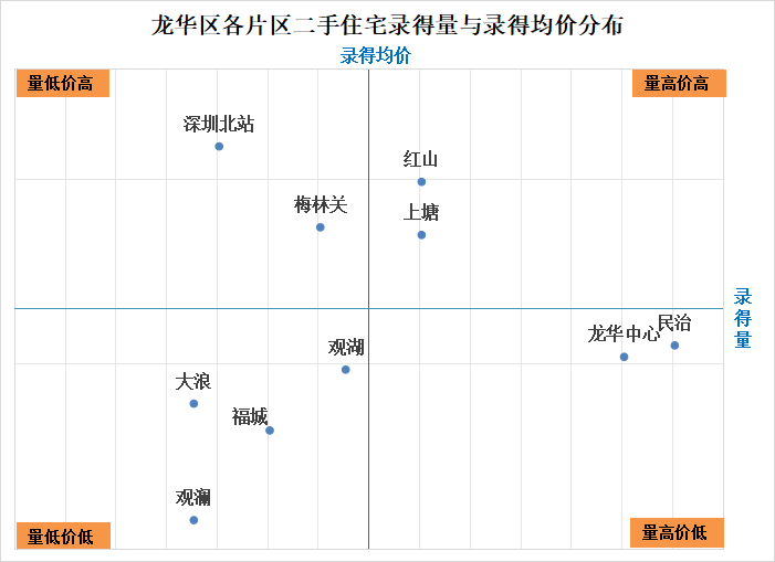 具体来看,红山和上塘片区位于第一象限,其交易活跃度与价格均高于龙华区均值,一定程度上体现出较强的抗风险能力。在成交房源中,深圳北站片区均价最高,观澜片区均价最低。具体分布如下图所示: