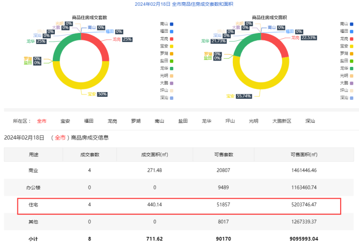2024年2月18日新房住宅共网签4套。宝安2套;福田0套;龙岗1套;罗湖0套;南山0套;盐田0套;龙华1套;坪山0套;光明0套;大鹏0套;深汕0套。