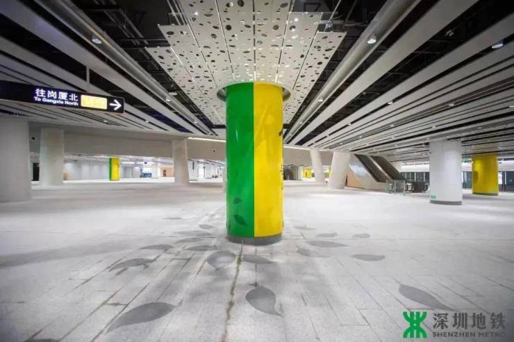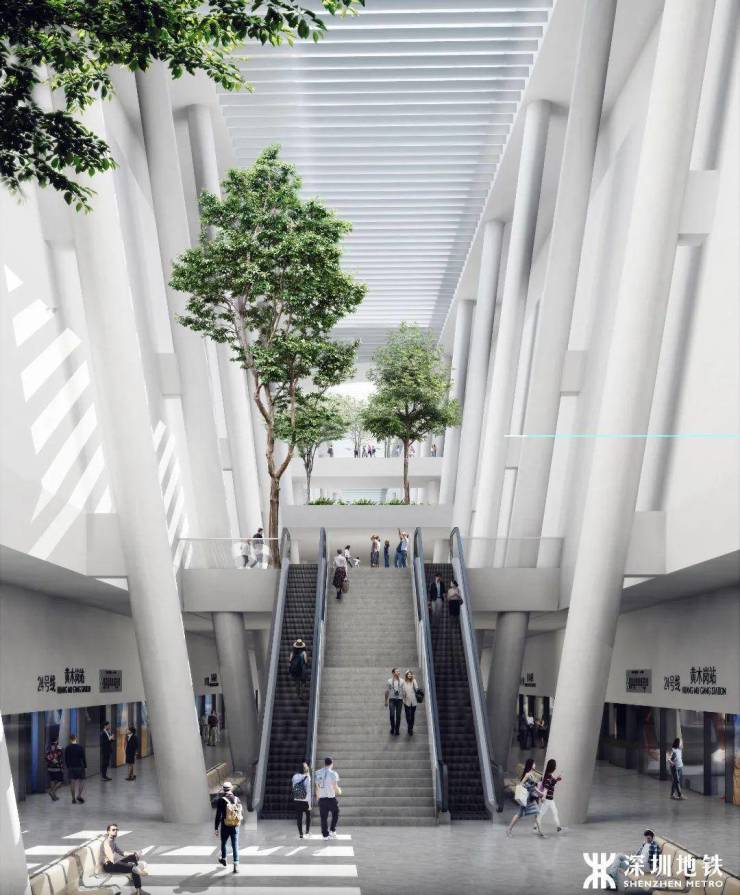 黄木岗枢纽集合天窗、中庭、绿植及V柱构建了纵贯东西的地下V型空间,以此空间为轴通过下沉广场与南北区域地块衔接,形成畅通完善的慢行联络系统,也大大提升市民出行体验。