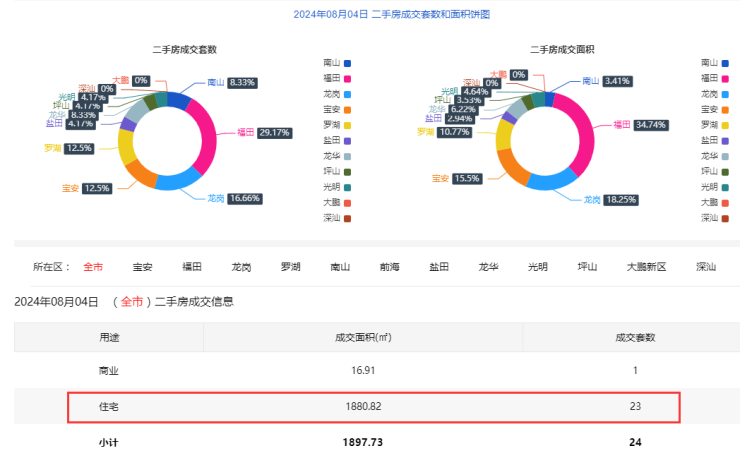 2024年8月4日二手房住宅网签23套。宝安3套;福田7套;龙岗4套;罗湖2套;南山2套;盐田1套;龙华2套;光明1套;坪山1套;大鹏0套。
