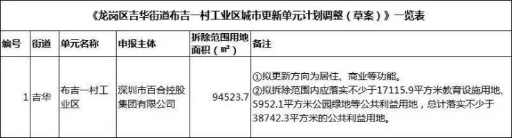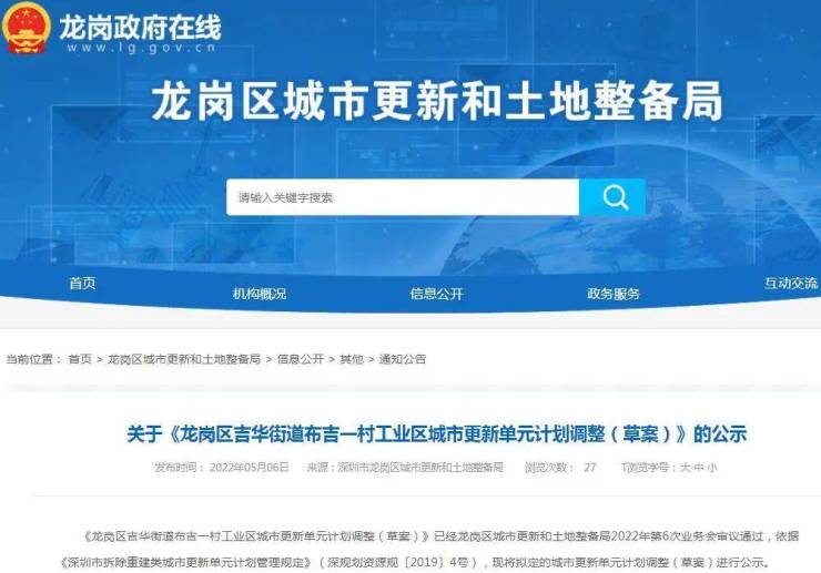 2022年5月6日,龙岗区发布吉华街道布吉一村工业区城市更新单元计划调整(草案)的公示。