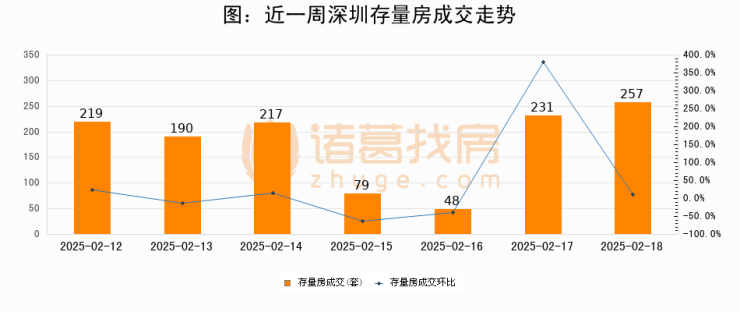从存量房来看,2025年02月18日深圳存量房单日成交257套,比昨日增加26套,环比上涨11.3%。从近一周存量房成交来看,深圳存量房日均成交套数为177套,02月18日单日成交257套,高于近一周平均水平45.2%。