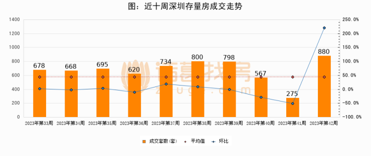 存量房方面,第42周深圳存量房成交880套,较上周增加605套,环比上涨220%。从近十周成交走势来看,周均成交套数为671套,本周高于平均水平31.1%。
