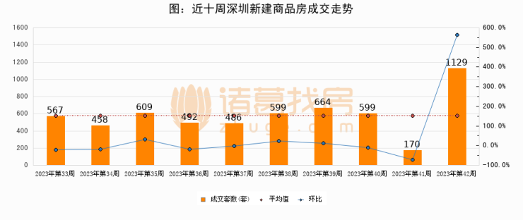 进入2023年第42周(10月09日-10月15日),深圳新建商品房成交1129套,较上周增加959套,环比上涨564.1%