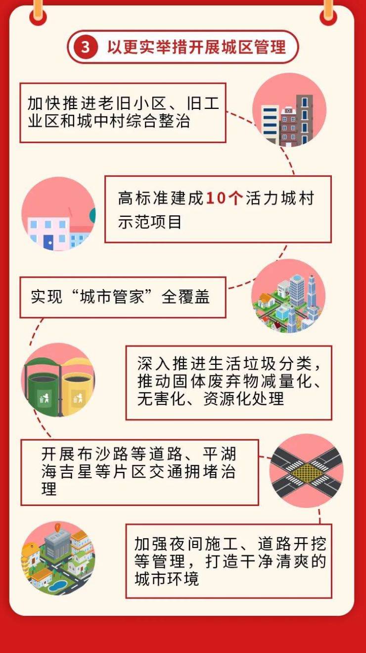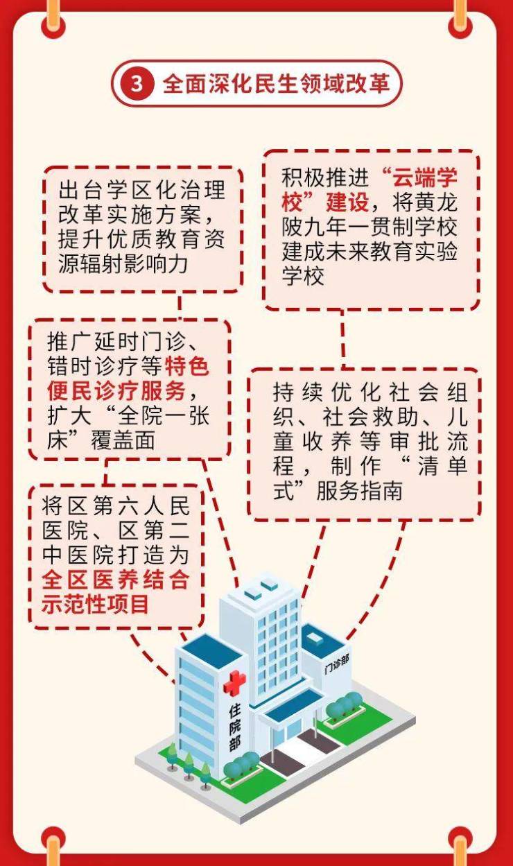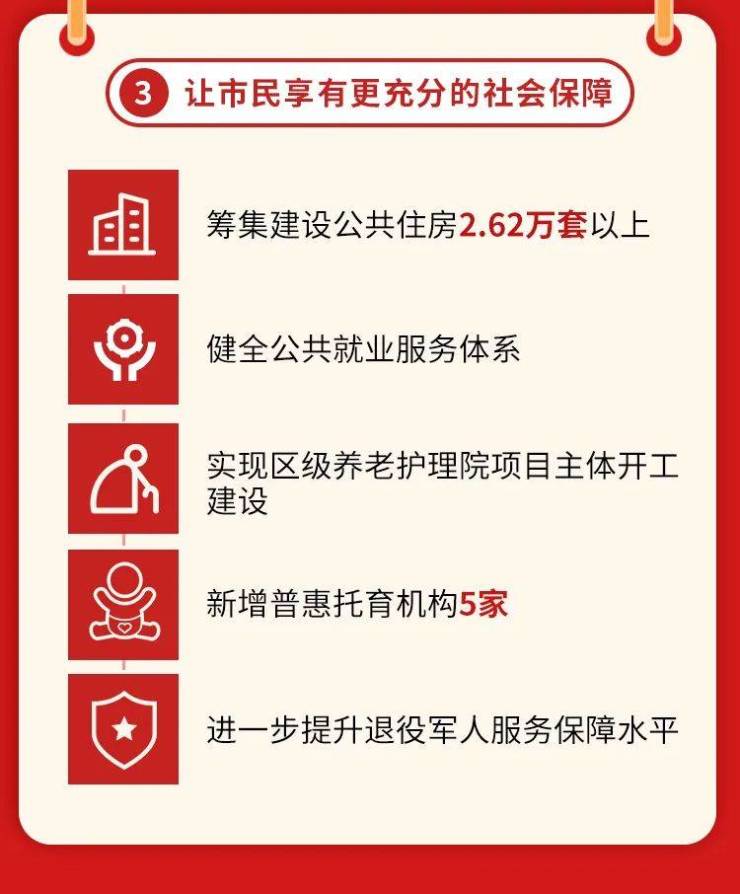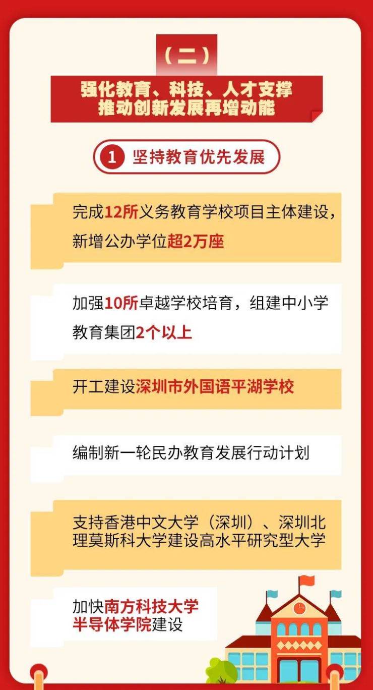 教育:完成12所义务教育学校项目主体建设,新增公办学位超2万座,加强10所卓越学校培育,组建中小学教育集团2个以上。