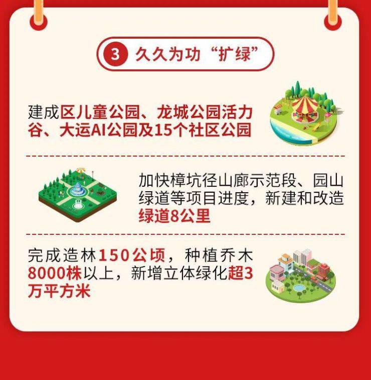 15个社区公园投入使用,大运AI公园、龙湖文体公园等5个重点公园开工建设,贯通90公里远足郊野径;10个活力城村示范项目顺利动工。