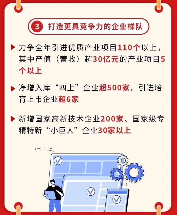 争取净增入库“四上”企业超500家,引进培育上市企业超6家,新增国家高新技术企业200家、国家级专精特新“小巨人”企业30家以上。