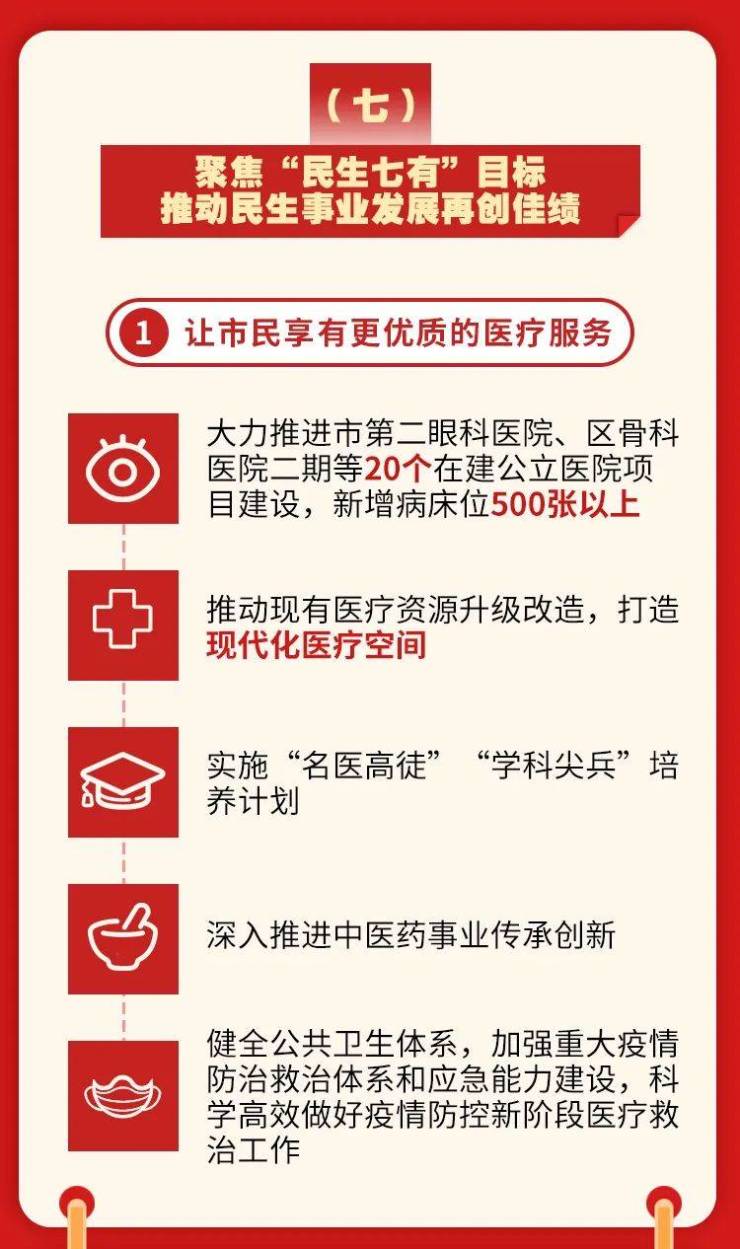 医疗:推进市第二眼科医院、区骨科医院二期等20个在建公立医院项目建设,新增病床位500张以上。
