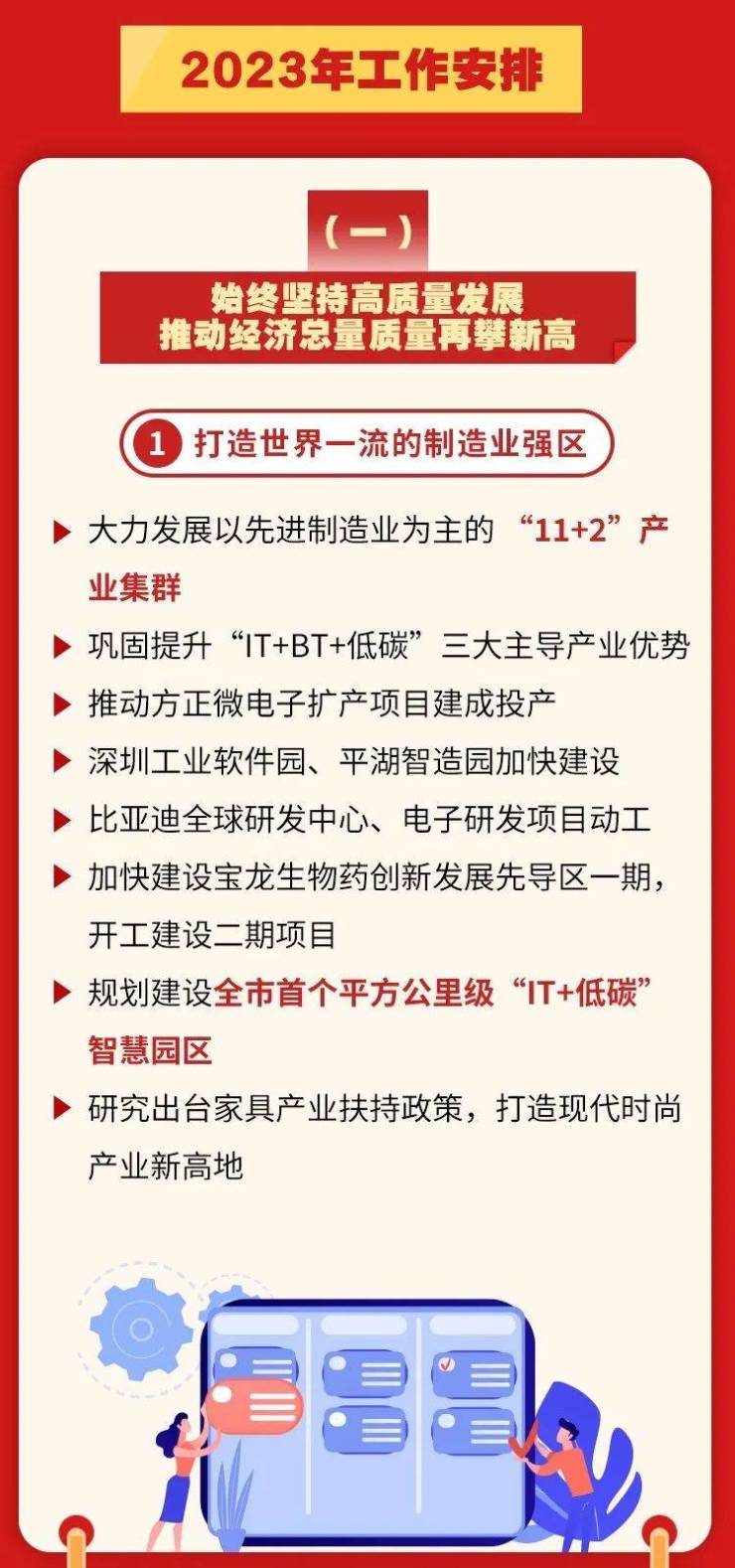 今年三大主导产业方面的重大项目分量十足:方正微电子扩产项目建成投产,深圳工业软件园、平湖智造园加快建设,比亚迪全球研发中心、电子研发项目动工;宝龙生物药创新发展先导区一期、二期项目加速。全市首个平方公里级“IT+低碳”智慧园区的规划建设提上日程。