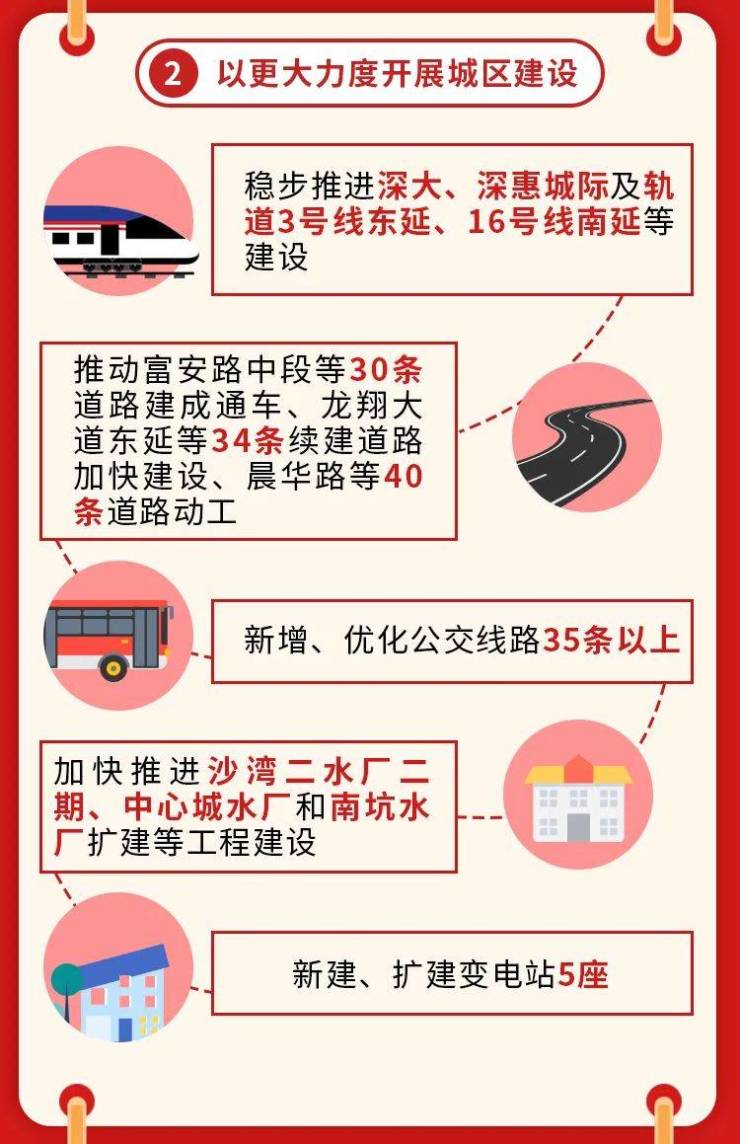 推进深大、深惠城际及轨道3号线东延、16号线南延建设,推动30条道路通车,加快34条续建道路建设和40条道路动工;