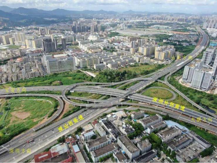 这是连接深圳外环高速与深汕西高速(暨沈海高速)的交叉型枢纽型立交(含8条匝道),主要解决深圳外环高速与深汕西高速公路的交通转换要求。