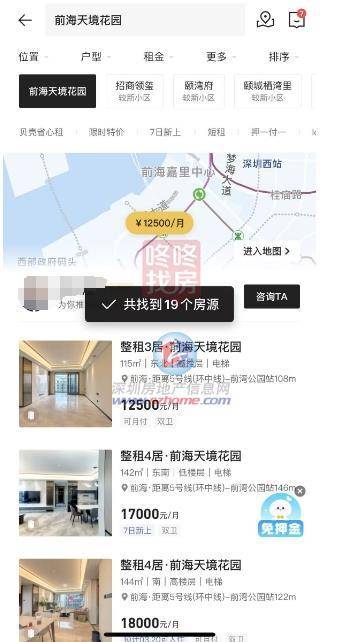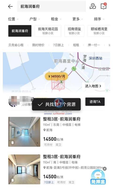 前海天境花园旁的前海润峯府业主挂租率更低一些,目前在贝壳平台上仅有7套在出租,110平的挂盘租金约1.38万-1.45万/月;150平的约2.3万/月。