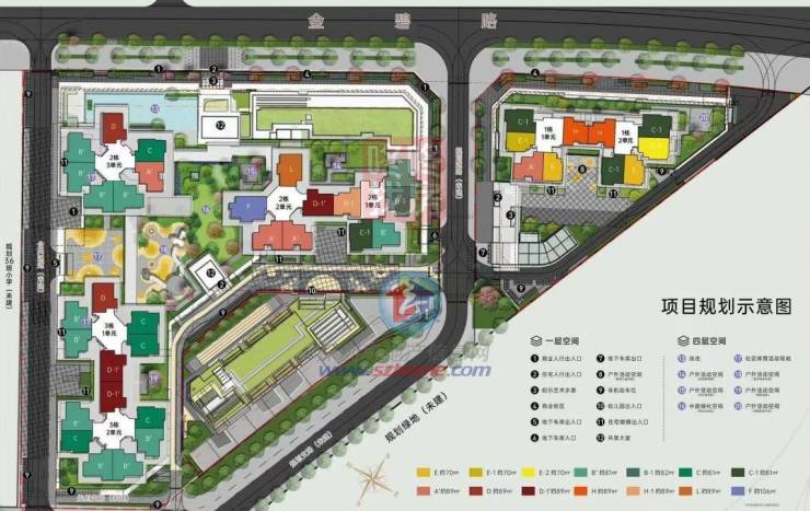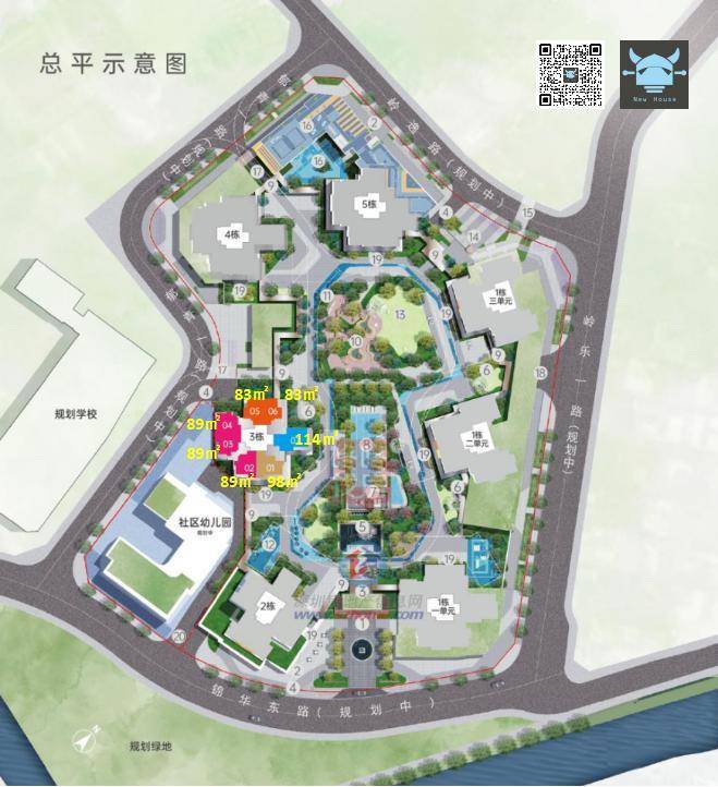 住宅规划总户数2136户(含回迁),可售商品住宅约1800户。停车位约2343个(含5个幼儿园车位),车位比约1.1.1。