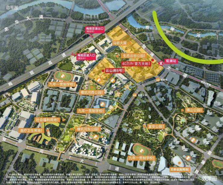 观城规划总建面约410万㎡,是当前深圳最大的旧城改造项目。一期为云山府8号,备案名为未来平方云山府,在生态云谷公园(马坜社区公园)和横坑河西公园之间,隔离了周边的两条主干道。