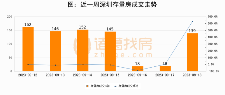 从存量房来看,2023年09月18日深圳存量房单日成交139套,比昨日增加120套,环比上涨631.6%。从近一周存量房成交来看,深圳存量房日均成交套数为111套,09月18日单日成交139套,高于近一周平均水平25.2%。