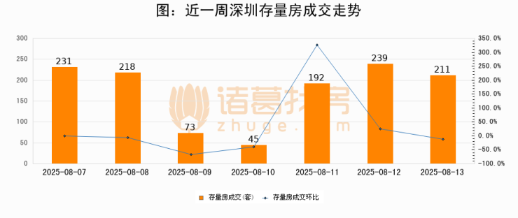 从存量房来看,2025年08月13日深圳存量房单日成交211套,比昨日减少28套,环比下降11.7%。从近一周存量房成交来看,深圳存量房日均成交套数为172套,08月13日单日成交211套,高于近一周平均水平22.7%。