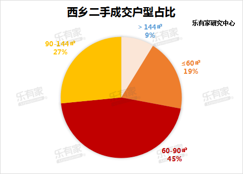 西乡二手房的成交户型占比中可以看出,建面约60-90㎡的户型是主流,占比高达45%,可以看出2-3房的刚需户型比较受捧。