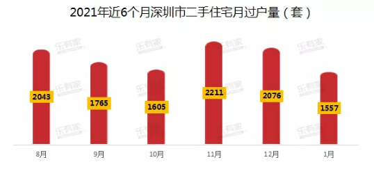 2021年二手房低迷蔓延到2022年,据乐有家研究中心数据显示,2022年1月深圳二手住宅过户1557套,环比下跌25%,同比下跌78%,单月数据创下新低。