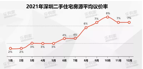据乐有家研究中心数据称,深圳2021年二手住宅成交周期为108天,同比缩短5天,二手房的议价空间逐月增大,往年很难议价成功的深圳二手楼市,2021年议价不仅成为常态,并且每月平均议价率整体还呈现了明显的走高趋势