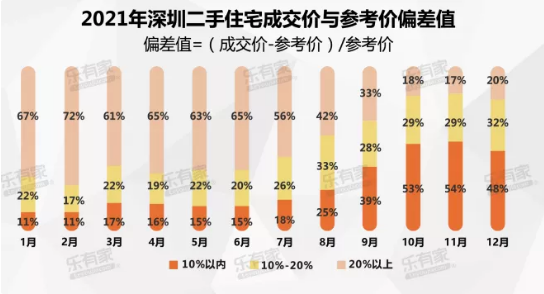 甚至成交价格越来越接近参考价。从乐有家公布的数据来看,2021年7月是分水岭,7月前成交价在参考价偏差值10%以内的成交量不足20%,尤其是1月、2月,议价空间小。从8月开始,到10月、11月,成交价在参考价偏差值10%以内的成交量占总成交量的一半左右,成交价在偏差值20%以上的成交量占比不足20%,反剪差明显。