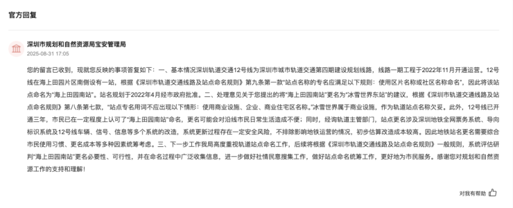 市规划和自然资源局宝安管理局回复表示,该局高度重视轨道站点命名工作,后续将根据《深圳市轨道交通线路及站点命名规则》一般规则,系统评估研判“海上田园南站”更名必要性、可行性,并在命名过程中广泛收集信息,进一步做好社情民意搜集工作,做好站点命名统筹工作,更好地为市民服务。