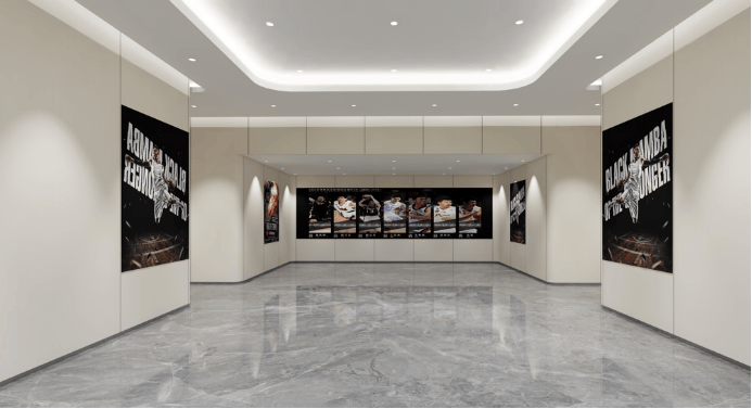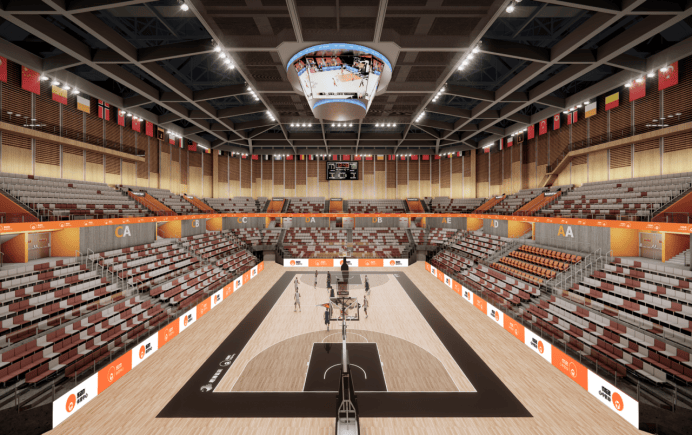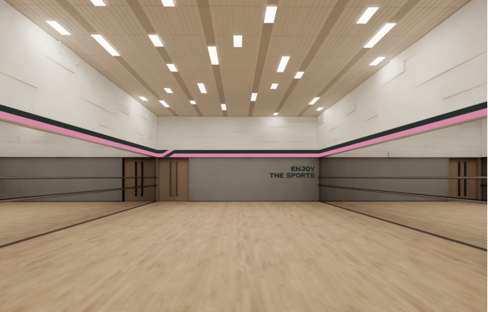 篮球馆采用运动专用木龙骨结构设计,铺装NBA赛事级枫桦实木地板,并涂覆瑞典博纳水性漆,同时配备FIBA认证篮板、24秒计时器及电子计分系统。
