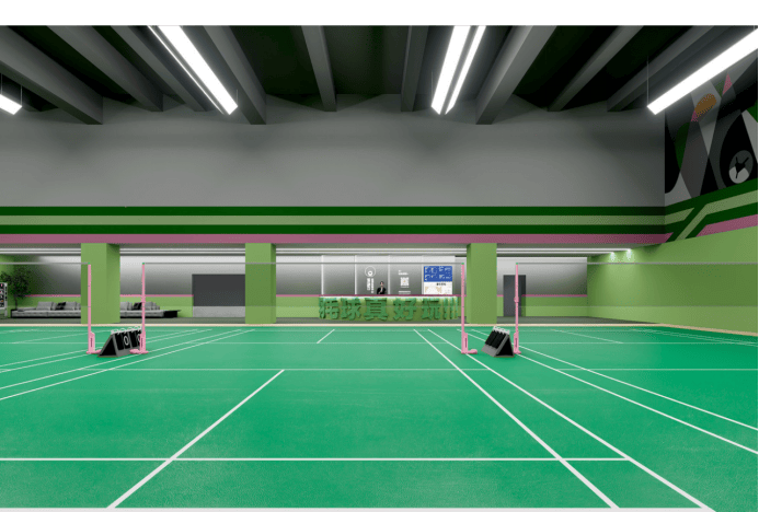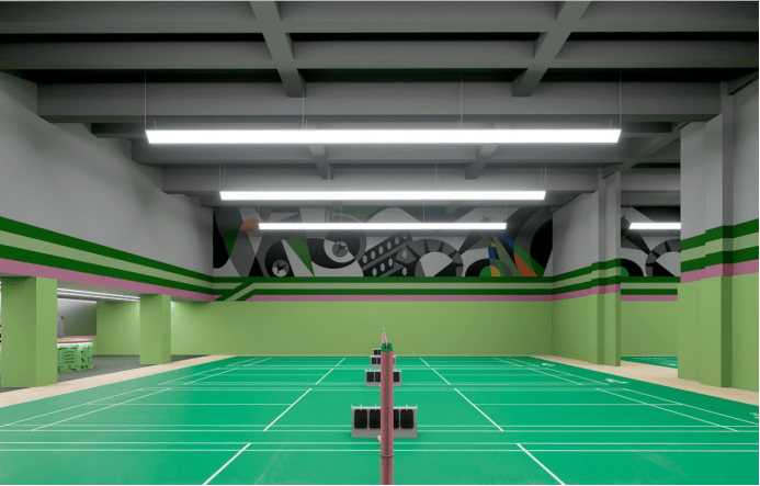 羽毛球馆内含8片专业羽毛球场,羽毛球专用灯具提供明亮而均匀的光线,助力精准击球。
