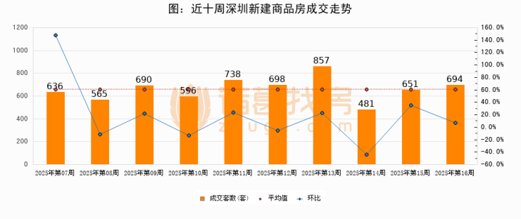进入2025年第16周(04月14日-04月20日),深圳新建商品房成交694套,较上周增加43套,环比上涨6.6%