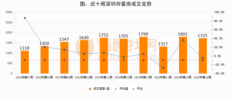 存量房方面,第16周深圳存量房成交1725套,较上周减少76套,环比下降4.2%。从近十周成交走势来看,周均成交套数为1574套,本周高于平均水平9.6%。