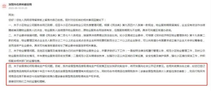 去年9月份,深圳市住房和建设局在答复中海阅景花园安居房相关问题时就曾提到过: