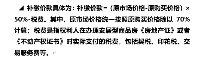 据3月13日官方发布的意见稿,安居房的补缴价款=(原市场价格-原购买价格)×50%-税费。其中,原市场价格统一按照原购买价格除以70%计算。