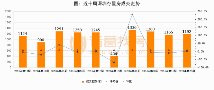 存量房方面,第22周深圳存量房成交1192套,较上周增加27套,环比上涨2.3%。从近十周成交走势来看,周均成交套数为1118套,本周高于平均水平6.6%。