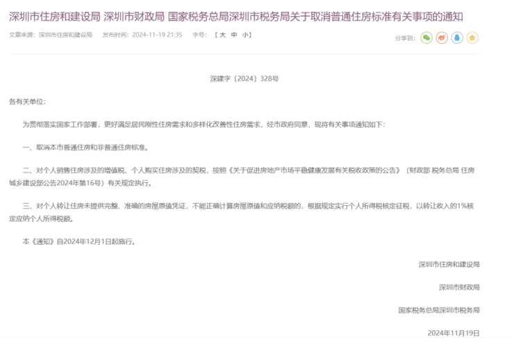 11月19日,深圳市住房和建设局、深圳市财政局、国家税务总局深圳市税务局等三部门联合印发《关于取消普通住房标准有关事项的通知》(以下简称《通知》),明确自2024年12月1日起取消普通住房和非普通住房标准,并对相关征税问题予以明确。