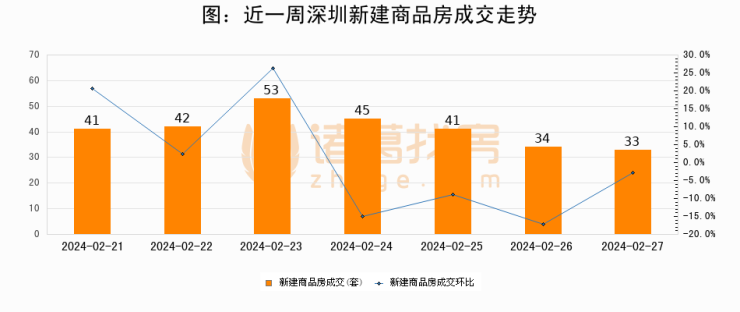 根据深圳市住房和城乡建设局数据显示,2024年02月27日深圳新建商品房成交33套,较昨日减少1套,环比下降2.9%。近一周深圳新建商品房日均成交42套。02月27日单日成交33套,低于近一周平均水平21.4%。