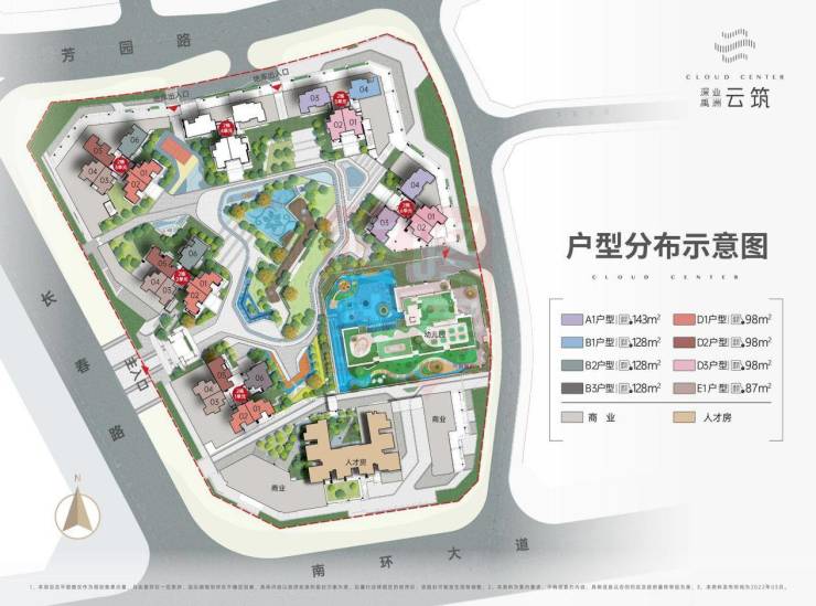 大社区由市政道路切分成南北两区,即将入市的南区(一期)在路口的西南象限,北区(二期)位于东北象限。