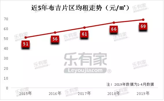 据乐有家研究中心数据显示,近5年来,布吉片区每年租金涨幅均比较稳定,2015年-2018年,每年的年度租金涨幅均保持在8%左右。2019年,租金涨幅有所减缓,该片区均租一直保持在69元/㎡左右,同比涨幅约5%。