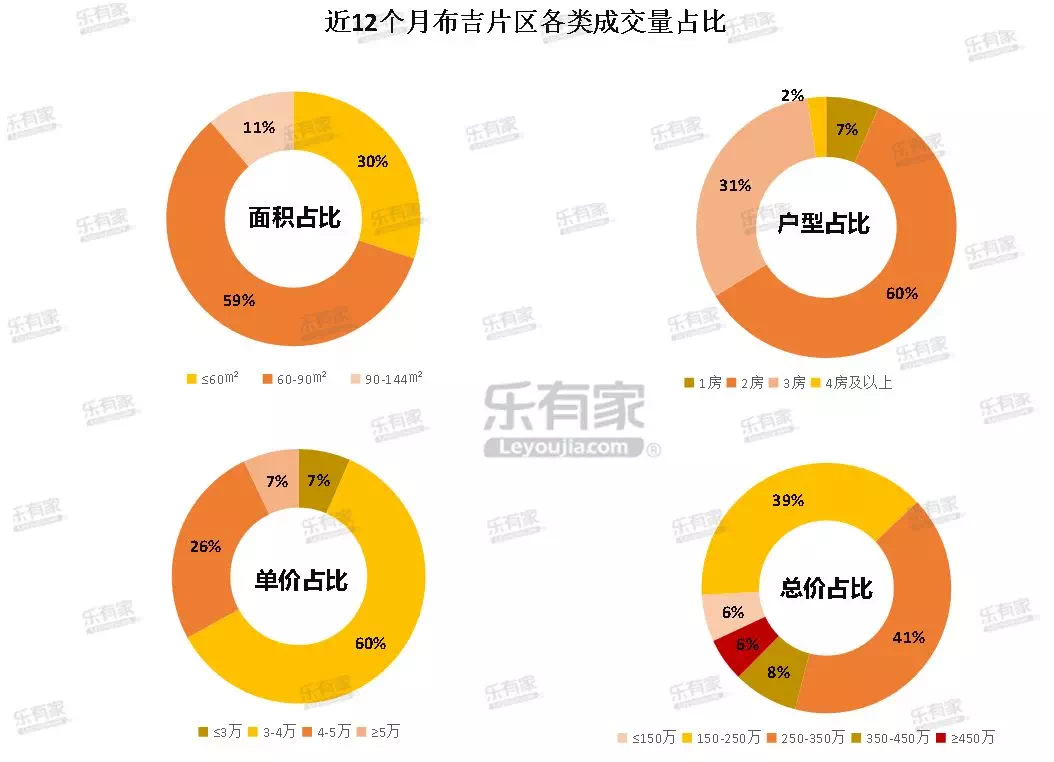 从近12个月布吉片区各类成交量占比来看,60-90㎡的户型面积占比达到了59%,该片区热门户型为2房,占比达到60%;60%的人群所购买的房屋单价区间在3-4万/㎡;以250-350万的总价成交的房屋占比较大。