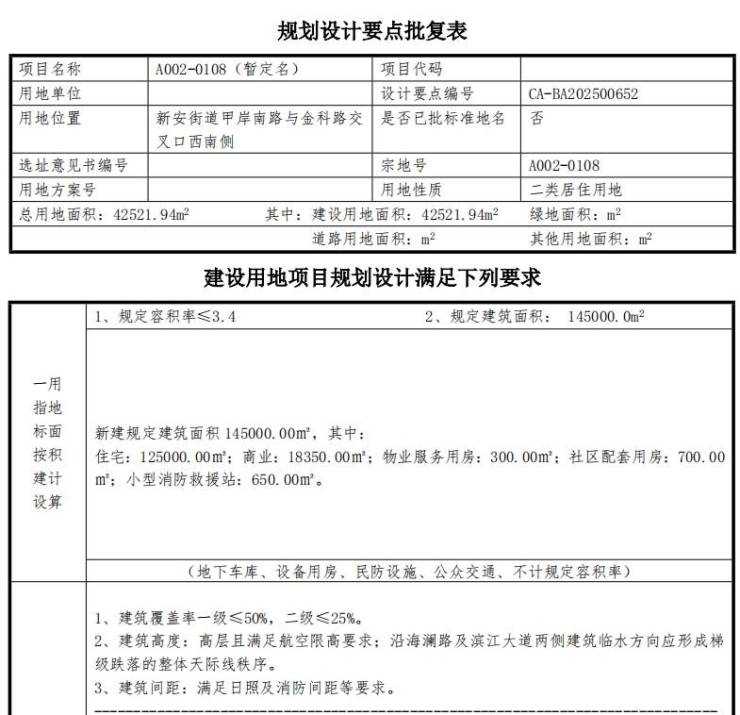 根据规划,A002-0108地块土地面积42521.94㎡,建筑面积145000㎡,容积率3.4,建设包括125000㎡住宅,18350㎡商业,300㎡物业用房,700㎡社区配套用房,650㎡消防站。