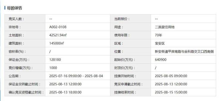 今天(8月15日)下午3点,宝中“王炸”地块,即A002-0108宗地将正式出让。据业内人士爆料,目前已有招商+华润、中海、建发等三家国央企报名(具体以实际为准)。